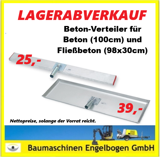![]() | **BETON-VERTEILER LAGERABVERKAUF** Entdecken Sie unsere hochwertigen Beton-Verteiler Wählen Sie zwischen dem schmalen Modell mit 100 cm Länge und flexiblem Griffaufsatz oder dem breiten Fließbeton-Verteiler mit den Maßen 98 x 30 cm. Ideal für präzises Arbeiten auf der Baustelle! siehe Shop: Art. FBV98-4kg am 39,- Netto siehe Shop: Art. BV100-2kg ab 25,- Netto |