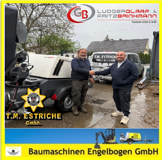 ![]() | Wieder einmal erfolgreich: Baumaschinen Engelbogen hat eine GB Estrichmaschine an die Firma T.M Estrich übergeben. Wir freuen uns, unseren Kunden mit hochwertigen Maschinen für perfekte Ergebnisse zur Seite zu stehen. Vielen Dank für das Vertrauen und auf weiterhin gute Zusammenarbeit! |